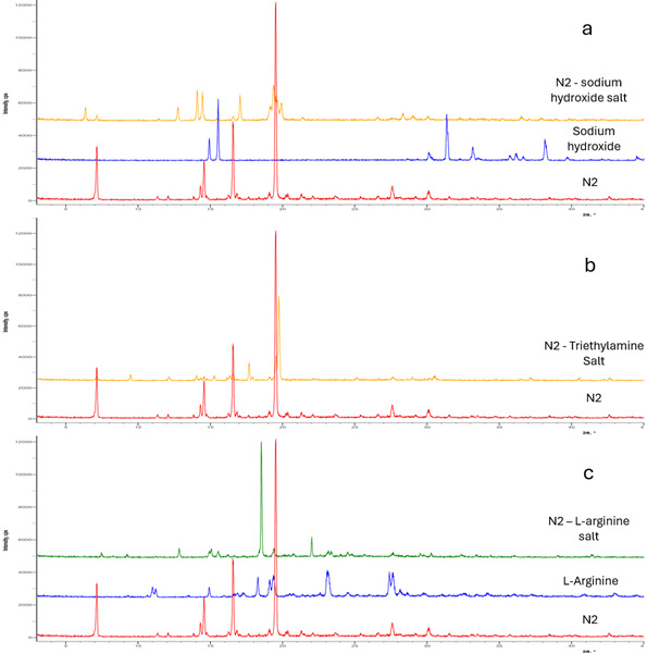Figure 2. PXRD patterns of, a) N2, sodium hydroxide, and sodium salt of N2, b) N2, and triethylamine salt of N2, c) N2, L-Arginine, and L-Arginine salt of N2