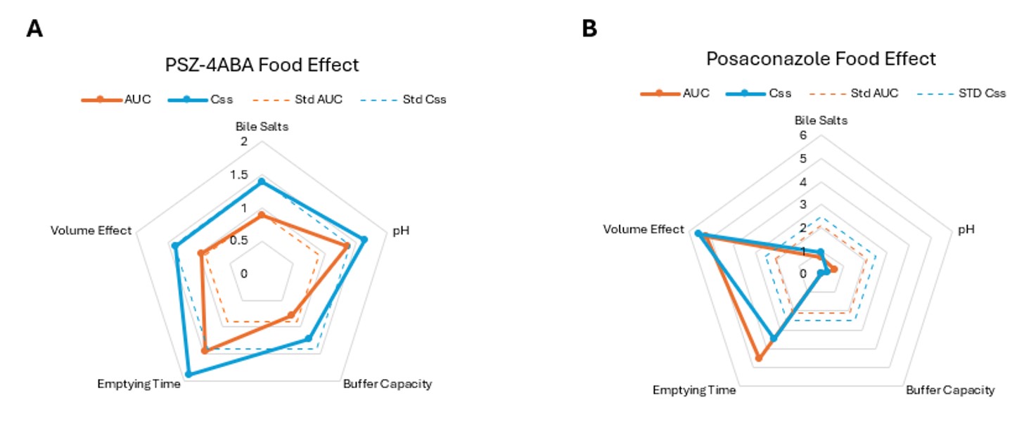Figure 1. Food effect radar plot for (A) PSZ-4ABA and (B) PSZ.