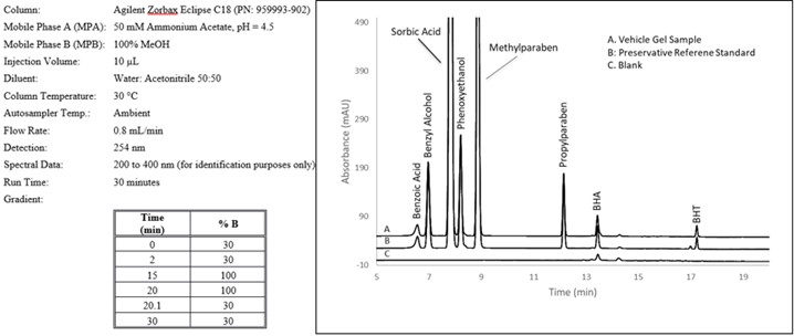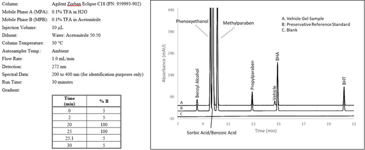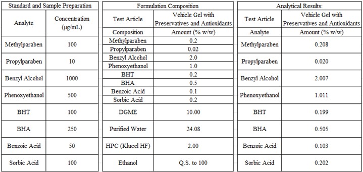 Figure 1. Standard and sample preparation concentrations for HPLC analysis, vehicle gel formulation composition, and analytical results of vehicle gel analysis.