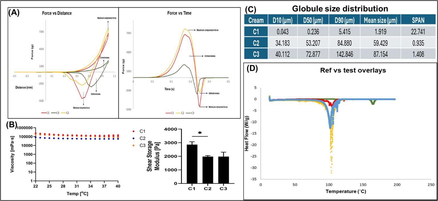 Figure 1: Physicochemical and structural characterization of pimecrolimus 1% creams. (A) Texture analysis of the creams was performed at room temperature (RT) using an XT Plus texture analyzer. Adhesive, cohesive, and mechanical forces were assessed and plotted as force vs. distance and force vs. time.