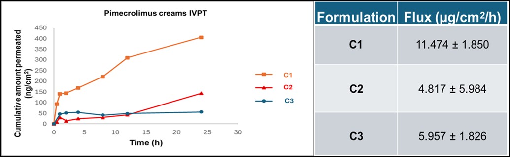 Figure 2: In vitro permeation studies were conducted using vertical Franz diffusion cells with a receptor volume of 5 mL and a donor surface area of 0.2 cm². The receptor medium consisted of 1× phosphate-buffered saline (PBS) containing 30% Transcutol® HP, pH 7.2. Porcine ear skin was prepared, cut to uniform thickness, and mounted between the donor and receptor compartments. The experiment was carried out for 24 hours at 32 ± 0.5 °C. Samples were collected at predetermined time intervals and analyzed for pimecrolimus content. All experiments were performed in triplicate (n = 3), and results are reported as cumulative amount permeated (ng/cm²) versus time. Steady-state flux values were calculated and expressed as mean flux ± standard deviation (S.D.).