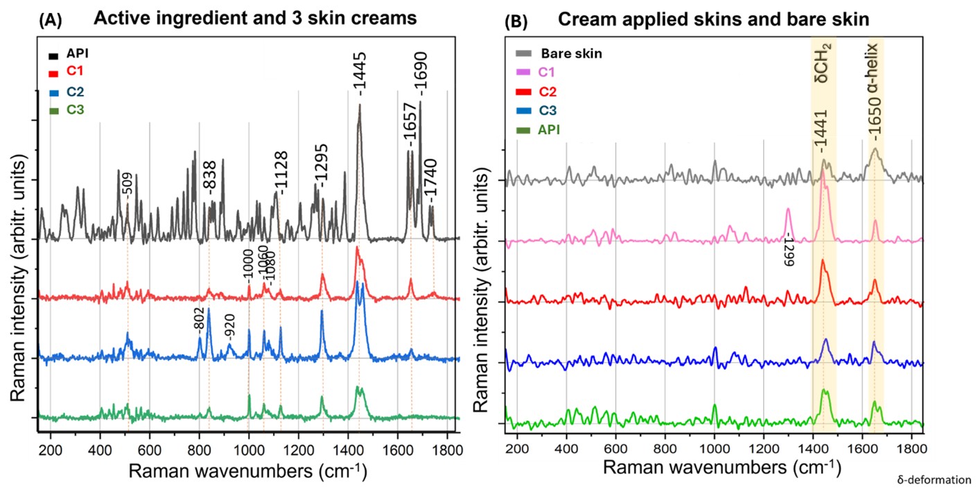 Figure 3: Representative Raman spectra were obtained using a confocal Raman microscope (LabRAM HR Evolution, HORIBA) within the fingerprint region (150–1850 cm⁻¹). Samples of pimecrolimus, as well as cream formulations C1, C2, and C3, were imaged both on microscope slides and on porcine ear skin membranes.