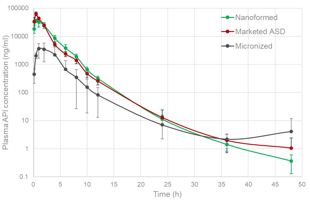 Figure 2: Rodent PK study of micronized, nanoformed and ASD formulations.