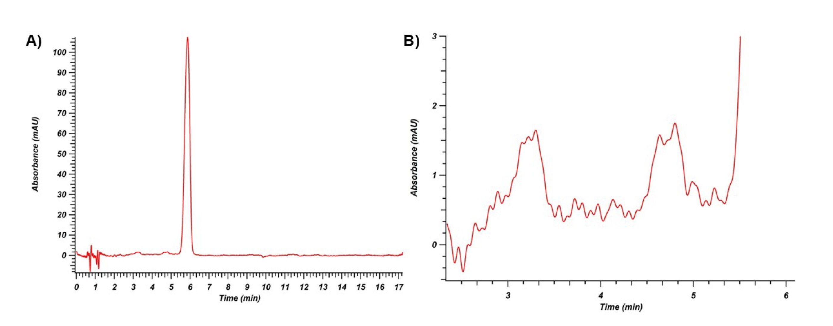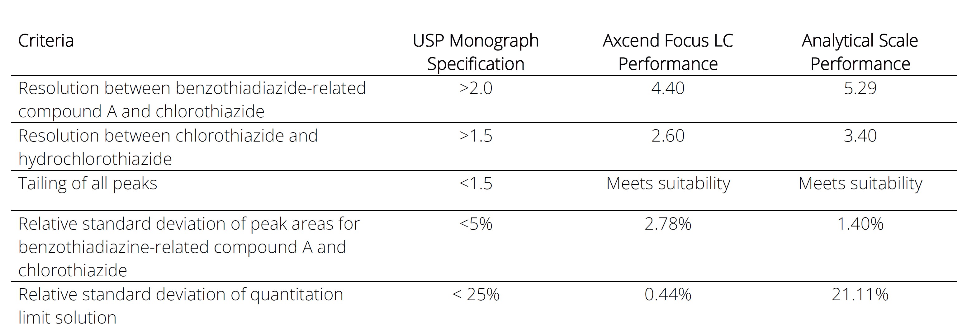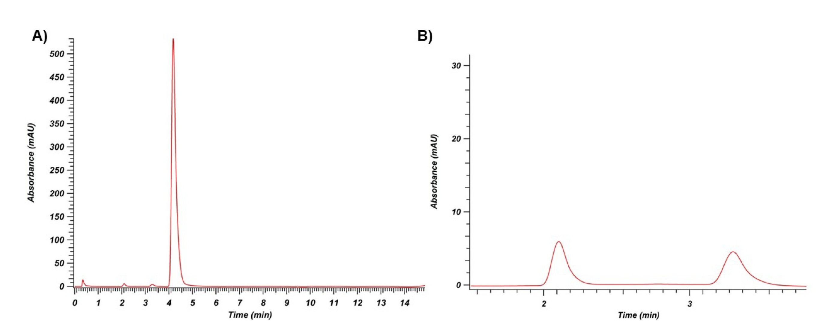Figure 2: Analytical scale chromatograms obtained following the USP monograph: (A) full test mixture separation, and (B) zoomed in time window of the separation focusing on benzothiadiazine-related compound A and chlorothiazide.