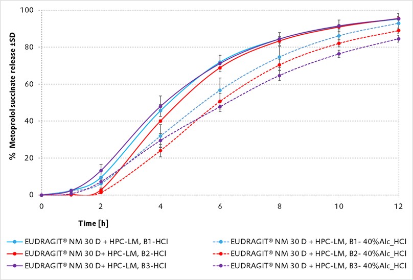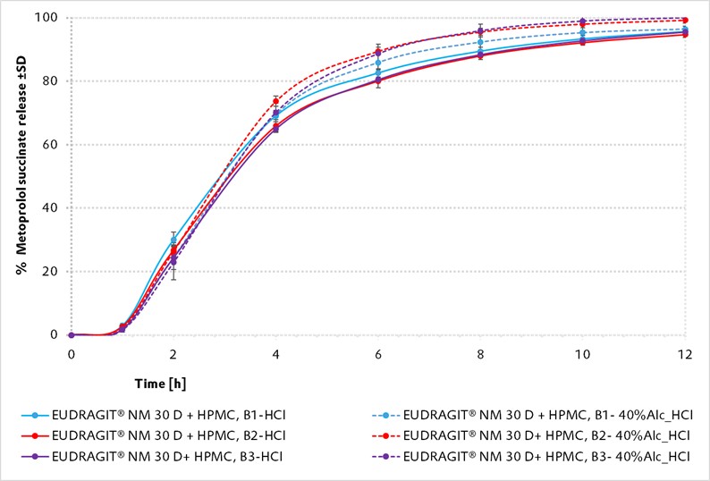 Figure 2: Alcohol resistance performance of reproducible batches of EUDRAGIT® NM 30 D+ HPC formulation