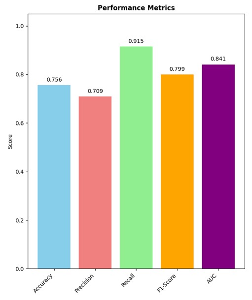 Figure 1. XGBoost model performance metrics showing high recall (0.92), AUC (0.84), accuracy (0.76), precision (0.71), and F-1 score (0.80) indicating strong sensitivity capability for predicting co-crystallization