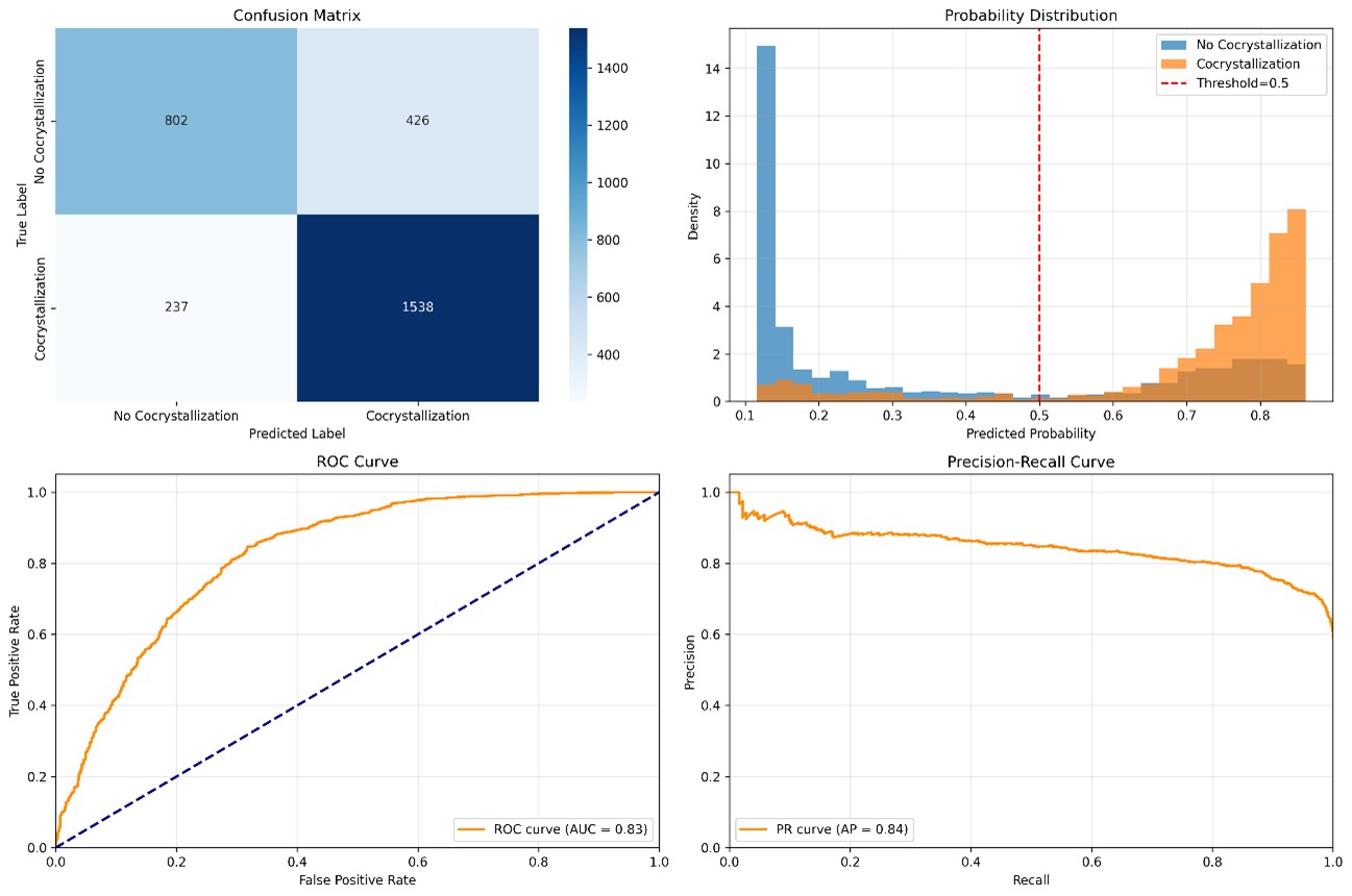 Figure 2. MPNN Model: Confusion matrix, probability distribution, ROC (AUC=0.83), and precision-recall curves (0.84) illustrating model performance, class separation and predictive reliability across the dataset