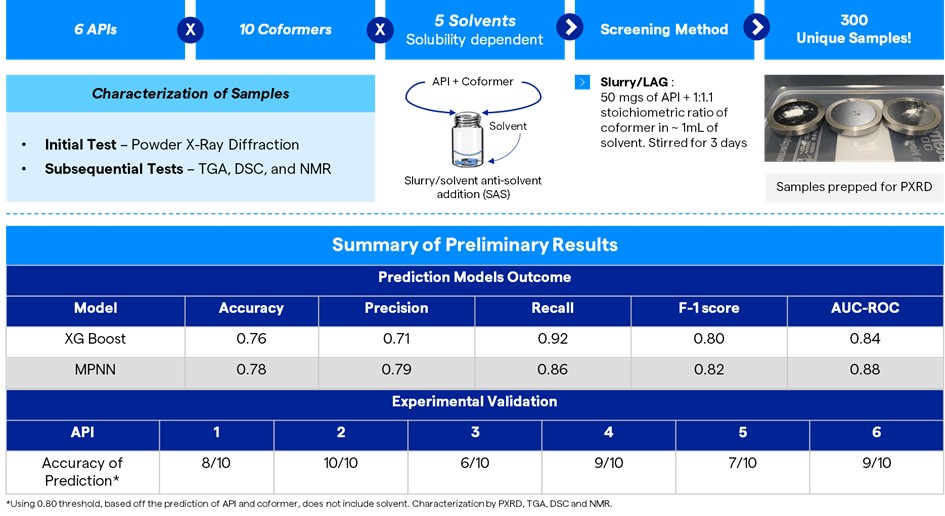 Figure 3. Screening of 300 API-coformer-solvent combinations; solid forms characterized by PXRD, TGA, DSC, and NMR. Tables summarize the performance metrics of the XGBoost and MPNN models and predictive model accuracy across six-APIs