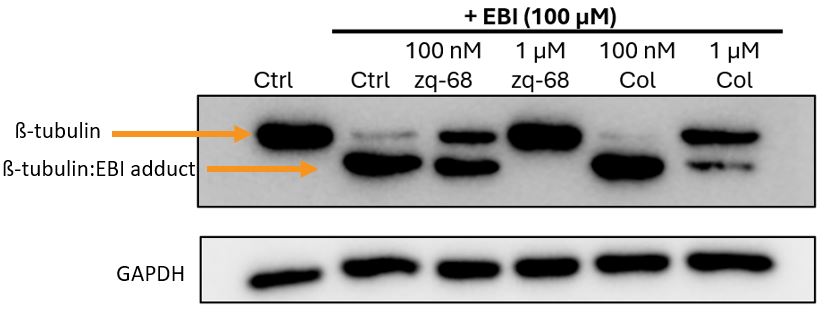 Western blot of the EBI competitive binding assay shows that zq-1-68 blocks formation of the ß-tubulin:EBI adduct, indicating that zq-1-68 binds tubulin at the colchicine binding site.