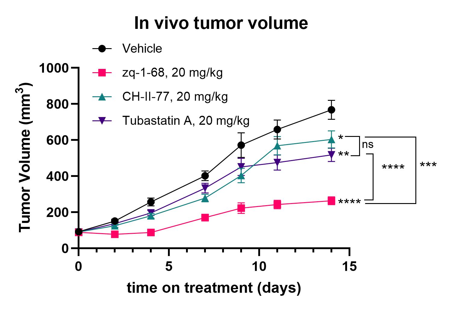 Zq-1-68 effectively inhibits growth of primary prostate cancer tumors in vivo. Tumor growth in the zq-1-68 treatment group was significantly inhibited compared to the CH-II-77 (tubulin inhibitor) and Tubastatin A (HDAC6 inhibitor) treatment groups