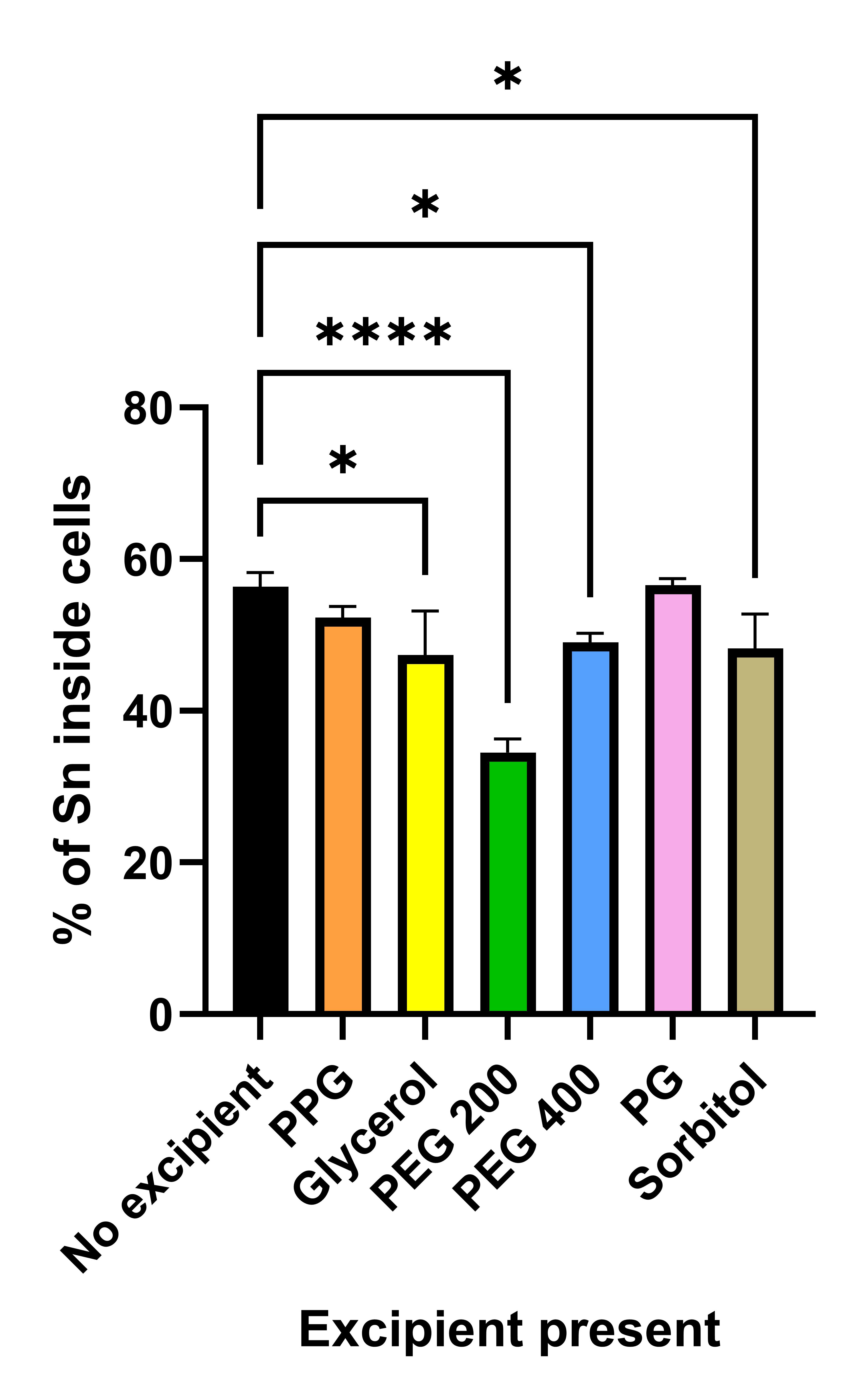 Percentage of applied Sn detected inside the cells in the presence of different excipients and DMEM. Statistical significance between control (no excipient) and conditions is indicated (*p < 0.05, ****p < 0.0001). (n=3, mean ± SD)