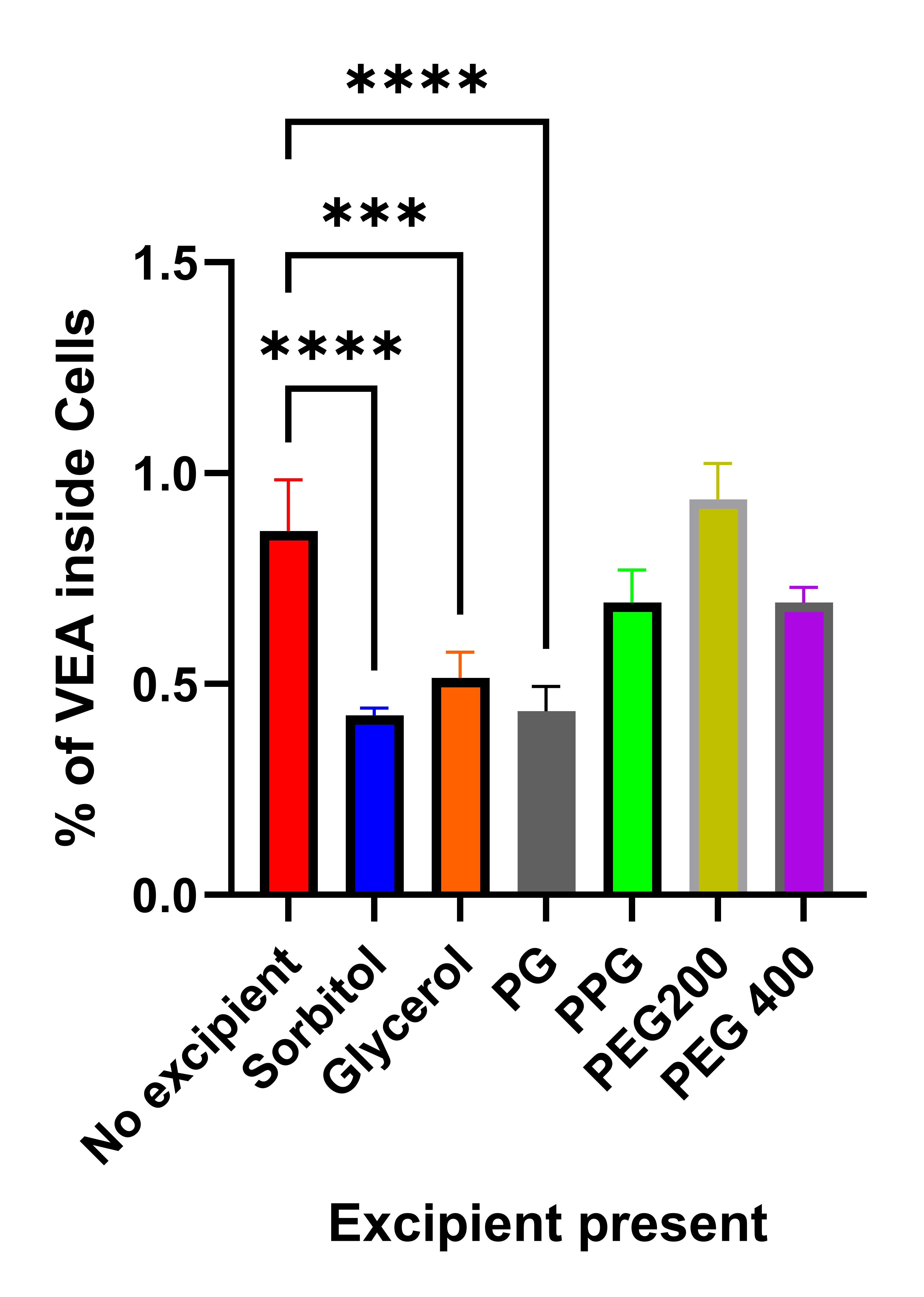 Percentage of applied VEA detected inside the cells in the presence of different excipients and DMEM. Statistical significance between control (no excipient) and conditions is indicated (***p < 0.001, ****p < 0.0001). (n=3, mean ± SD)