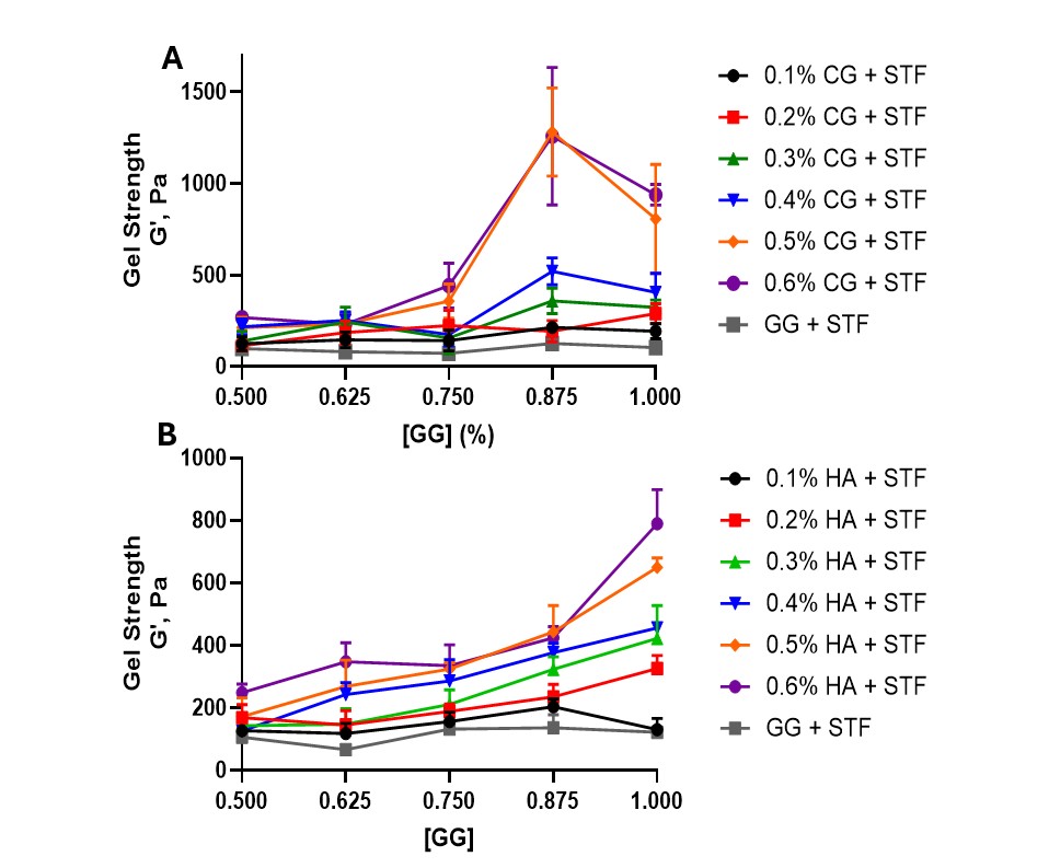 Figure: Binary combinations tested for concentration dependent synergy. A. Amplitude oscillation was performed over a range of concentrations of gellan gum (GG) (0.5% - 1.0% (w/v)) and carrageenan (CG) (0.1% - 0.6% (w/v)) with and without STF as singular polymer samples and binary polymer combinations (n = 3). (GG) + STF served as the positive control to indicate the basal level of gel strength. Data shown as mean ± SD B. Amplitude oscillation was performed over a range of concentrations of gellan gum (GG) (0.5% - 1.0% (w/v)) and hyaluronan (HA) (0.1% - 0.6% (w/v)) with and without STF as singular polymer samples and binary polymer combinations (n = 3). (GG) + STF served as the positive control to indicate the basal level of gel strength. Data shown as mean ± SD