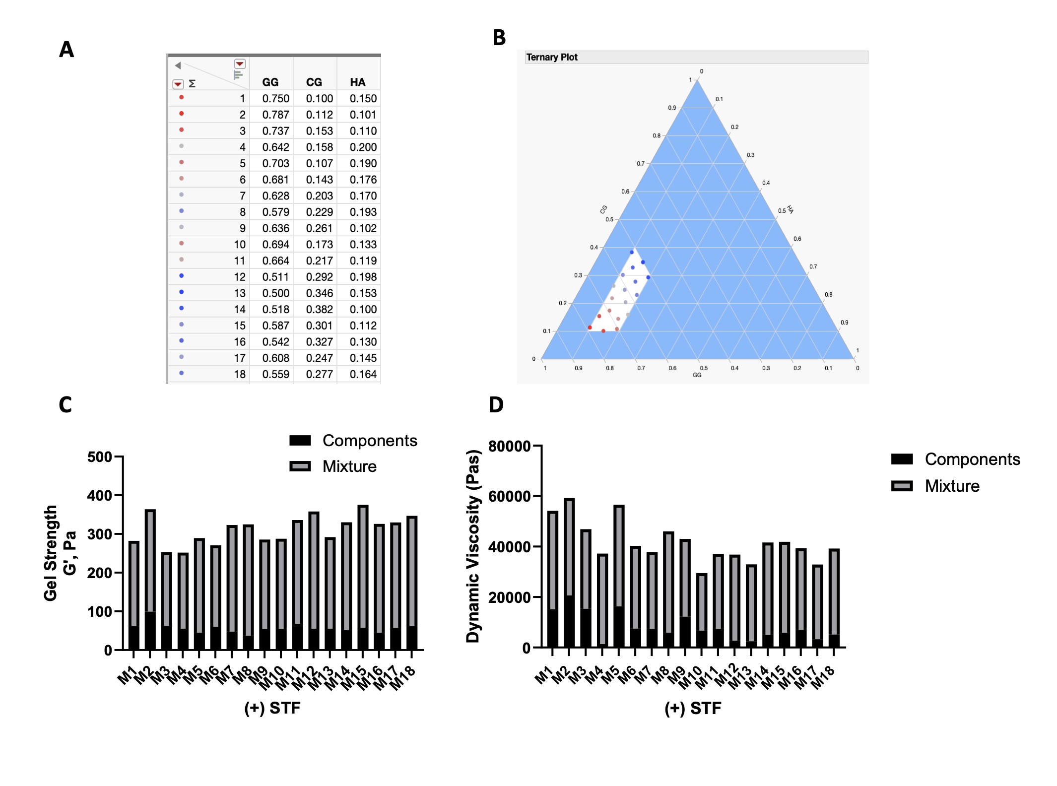 Figure: Space filling mixture design for three component mixture formulation. A. SFMD generates 18 distinct formulations for testing. B. Ternary plot defines the experimental space. Colored dots indicate distinct formulations and fill the concentration gaps typical of classical boundary point mixture designs. C. Amplitude oscillation was performed on 18 formulations composed of three polymer mixtures containing gellan gum %(GG) (0.5 - 0.8 (w/v)), carrageenan %(CG) (0.1 - 0.5 (w/v)), and hyaluronan %(HA) (0.1 - 0.2 (w/v)) with and without STF as singular component samples and Mixture (M1-M18) samples (n = 3). Components plotted as the sum of G’ of individual polymer samples. Data shown as mean ± SD. D. Amplitude oscillation was performed on formulations from A as described in C. Components plotted as the sum of dynamic viscosity of individual polymer samples. Data shown as mean ± SD.
