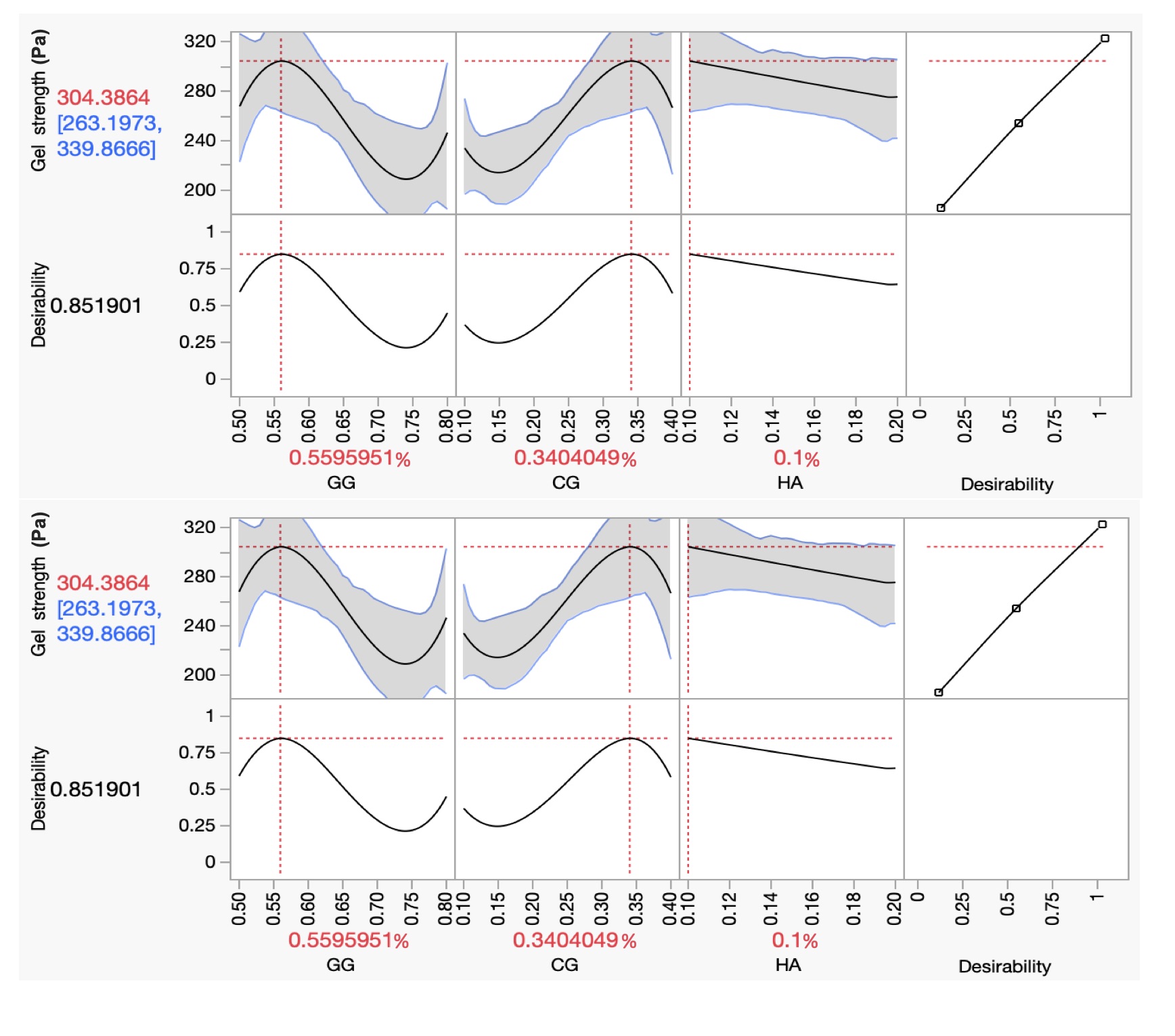Figure: DOE method optimizes three component mixture formulation. Optimized formulation using analyzed data via a generalized regression model and prediction profiler in JMP Pro 18.